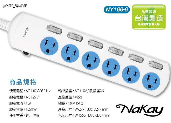 【NAKAY】6呎 六開六插安全延長線 NY166-6(台灣製造) 評價